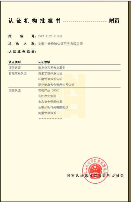 安徽中青檢驗認證服務有限公司成立于2017年6月6日,2018年1月3日通過國家認證認可監督管理委員會批準,現認證領域:質量管理體系、環境管理體系、職業健康安全管理體系、食品安全管理體系、HACCP管理體系、有機產品認證、良好農業規范、服務體系、醫療器械質量管理體系、企業誠信管理體系、食品工業企業誠信管理體系、食安安徽品牌等類別認證。